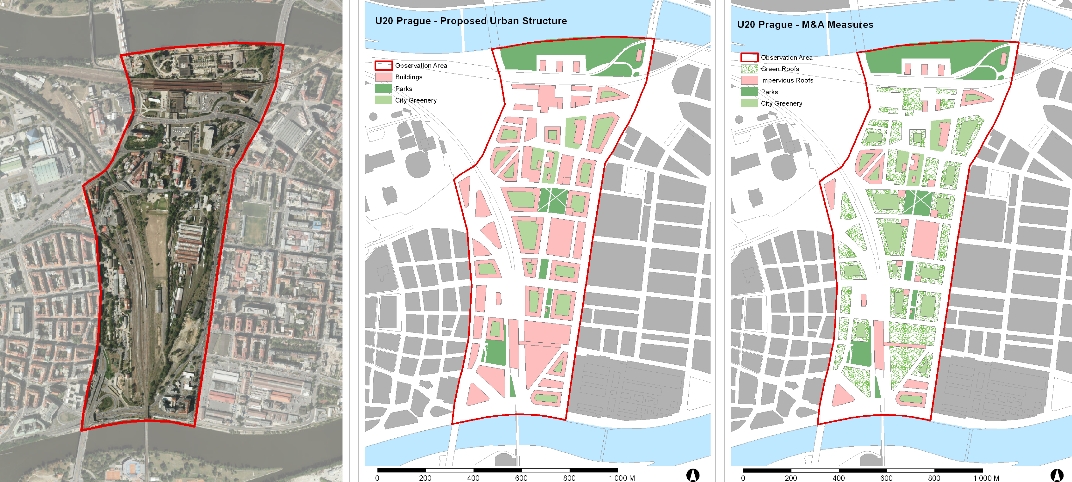 Variantně bude ověřena změna zastřešení nově navrhovaných objektů. Oproti běžným plochým střechám bude alternativně prověřeno využití zelených střech na všech nově navrhovaných objektech, kde to jejich konstrukce dovolí. Zvažuje se i o variantním prověření odlišné struktury zástavby s větším parkem a o výpočtovém ověření jeho vlivu na efekt tepelného ostrova města ve zkoumané lokalitě.