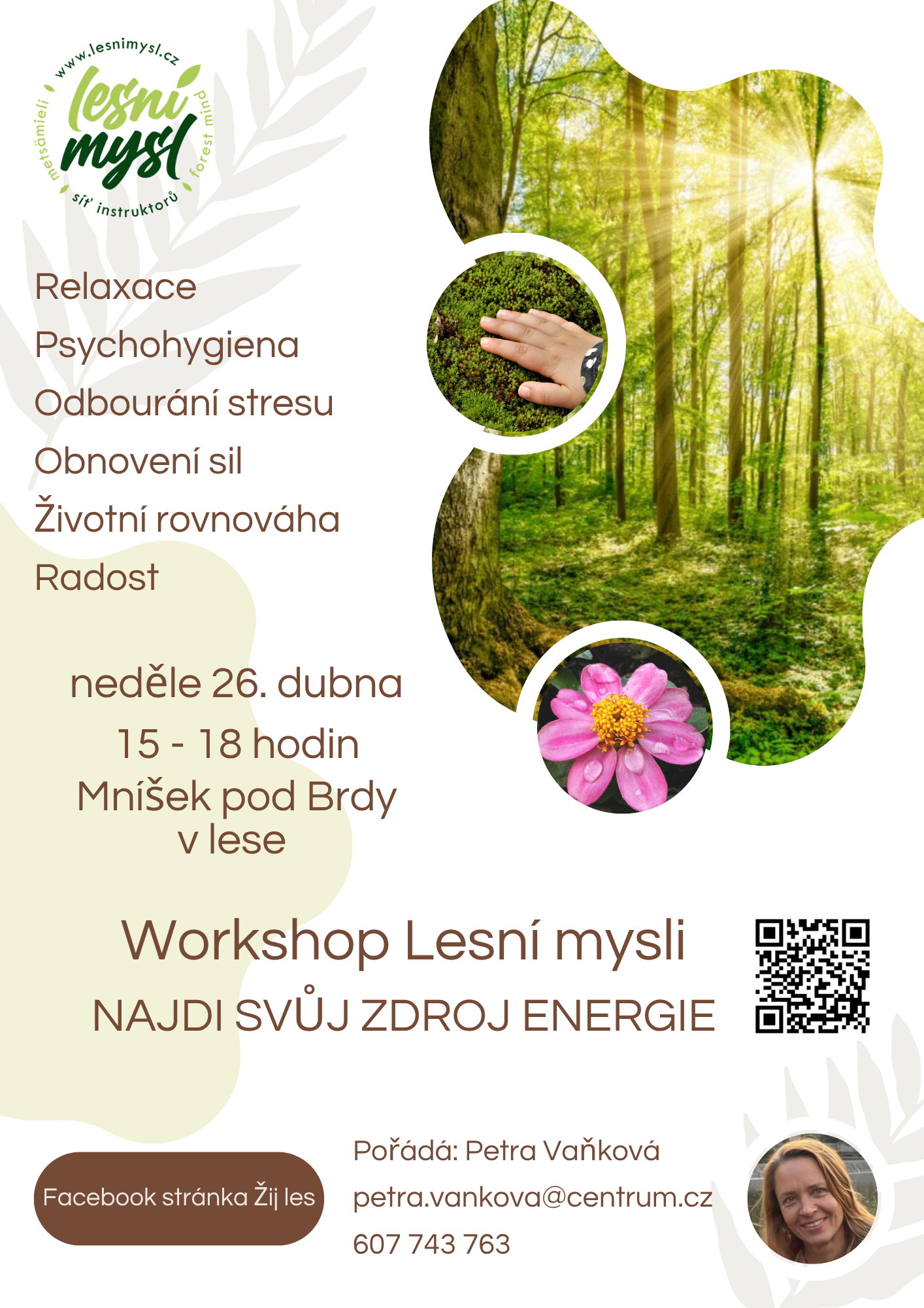 Workshop Lesní mysli s tématem „Najdi svůj zdroj energie“ je určený pro každého, kdo cítí potřebu zpomalit, nadechnout se a znovu objevit svůj vnitřní zdroj síly.