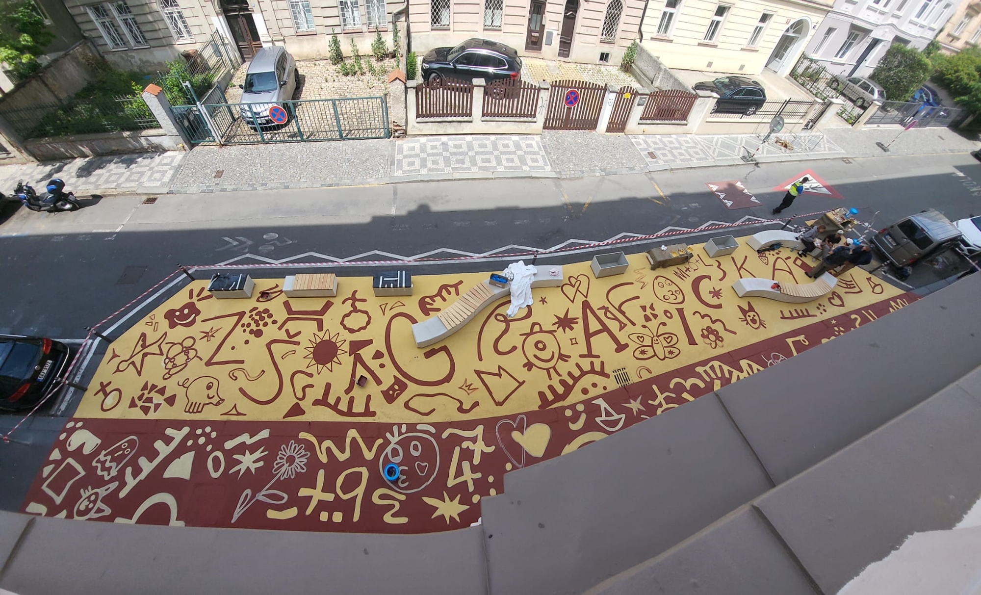 Motiv asfalt artu navazuje na tradici místa – v Grafické ulici totiž kdysi sídlily grafické závody Václava Neuberta, významného prvorepublikového tiskaře a nakladatele. Výtvarný návrh proto pracuje s písmeny, číslicemi a kartografickými symboly. Na jejich podobě se podílely samy děti ze školy, které je v červnu 2025 také společně namalovaly na chodník před školou.