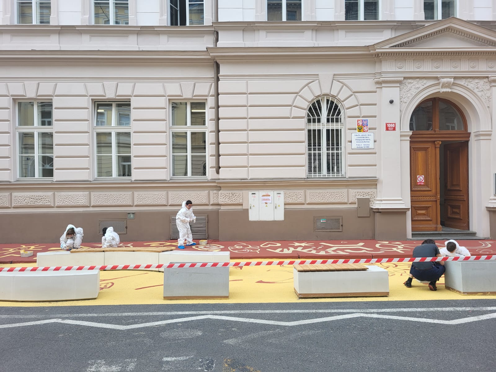 Barevný asfalt art před školou na pražském Smíchově zvětšuje bezpečnost chodců v ulici