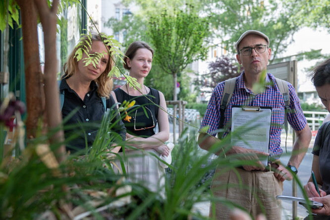 S tou přichází na schůzku s Bieno výpravou také Katharina Mauss z inovačního centra Gruenstatt Grau, které od roku 2017 propojuje vědu a výzkum s veřejným sektorem za účelem adaptace města na klimatickou změnu. Se zalaminovanými fotografiemi budov ve stavu „před“ nás bere na procházku po několika příkladech ozeleněných budov. Je horké červnové odpoledne a my máme možnost pocítit účinky zelených fasád, jakožto přírodní klimatizace, na vlastní kůži. A právě Bieno je prosazuje, navrhuje a realizuje v Praze.