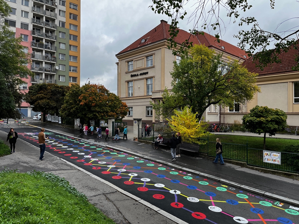 Prostor před ZŠ Jarov na Žižkově oživil nově tzv. asfalt art. Je to už třetí místo v Praze