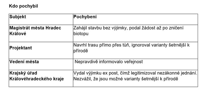 Namísto toho, aby Krajský úřad Královéhradeckého kraje řízení zastavil a oznámil podezření z porušení zákona, výjimku přesto vydal. Ačkoli věděl, že předmětná tůň už neexistuje, a že stavba probíhá v rozporu s předchozí dokumentací, úřad vydal nové rozhodnutí, které teprve 9. října 2025 nabylo právní moci. Tedy v době, kdy již všechny biotopy (vodní i suchozemské) byly zničeny.Tím ovšem fakticky legitimizoval protiprávní jednání magistrátu.