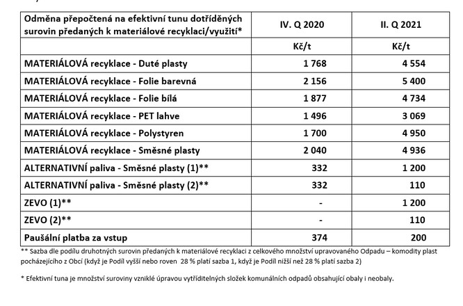 • Ve dvou krocích byly zvýšeny platby třídicím linkám za vytřídění a předání odpadu k materiálové recyklaci, toto navýšení efektivně znamená zvýšení podpory materiálové recyklace o 150 % oproti roku 2020.