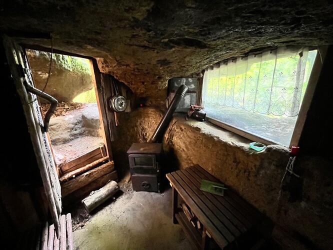 Vnitřek skalní dutiny U Boba okupované trampy: kamna a okno se záclonkami. Licence | Všechna práva vyhrazena. Další šíření je možné jen se souhlasem autora Foto | Ivan Brezina