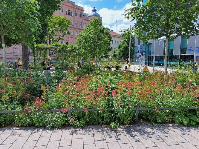 V centru Vídně jsme navštívili několik revitalizovaných ulic a náměstí. Ulice Zollergasse (Obr. 17) prošla úpravou v r. 2021 a pro výsadbu 25 let starých stromů byl použit Stockholmský systém. Vznikla zde spousta zeleně poskytující stín a pro ochlazení byly do chodníku instalovány tři trysky a tři mlžítka vytvářející potůček. Přebytečná voda je odváděna do trvalkových záhonů.