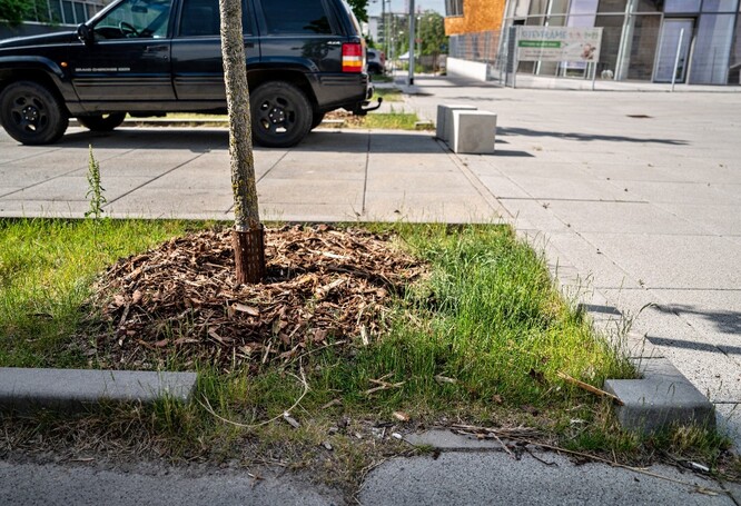 Dešťová voda odtékající z parkovišť je odváděna do průlehů osázených stromy, které díky tomu mají dostatek závlahy (Obr. 1). Průlehy jsou propojeny drenážním potrubím a nadbytečná voda se vsakuje.
