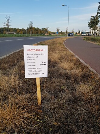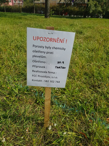 19. září loňského roku jsem navíc zažila velmi nepříjemnou osobní zkušenost. Toho dne jsem šla mezi 7 a 8 hodinou ranní venčit svého psa. Po cestě jsem míjela rodiče, kteří vodili své malé děti do mateřské školky. Cestou jsem potkala také několik pejskařů. V tomto čase bývá na ulicích celkem rušno. V jedné z bočních ulic jsem zahlédla muže oblečeného do ochranného oděvu, s rukavicemi, pokrývkou hlavy a pracovní obuví. Na zádech měl kanystr a v ruce držel hadici. Aplikoval ROUNDUP. Nikde žádná cedulka, pouze v té ulici, kde právě probíhala aplikace. Ptala jsem se ho, kudy se mohu vrátit domů, ať se vyhnu ošetřeným plochám. Pán odpověděl, že místa, odkud jsem přišla, jsou kompletně hotová… Byla jsem v šoku. Jednalo se o ulici, na které je mateřská školka, dětské hřiště... Svoji fenu jsem vzala do náruče a takto jsem ji nesla až domů… Absurdní je, že chodník, který byl právě ošetřen, nevykazoval žádné známky zaplevelení.