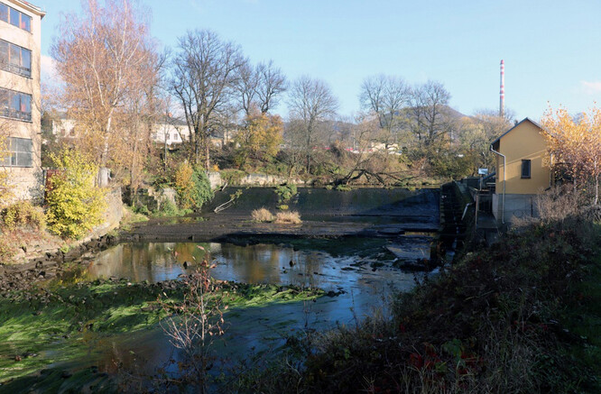 Jez a elektrárny na Ploučnici při vyšším průtoku vody. Licence | Všechna práva vyhrazena. Další šíření je možné jen se souhlasem autora Zdroj | Český rybářský svaz, Severočeský územní svaz