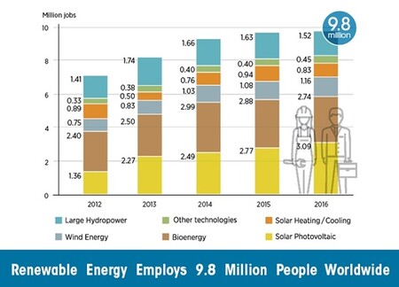 V Německu zaměstnává fotovoltaika 30 000 pracovníků, obnovitelné zdroje celkem pak přes 300 000, zatímco těžba uhlí nabízí práci jen 30 000 lidem. Kvůli útlumu těžby klesají počty horníků nejen v Německu (o 90 % za posledních 30 let), ale také v již zmíněných Spojených státech (přibližně o 70 % za posledních 30 let). Nestabilní situace panuje rovněž v naftařských společnostech. Ty v letech 2015 a 2016 propustily přinejmenším 440 000 lidí, z toho 40 % ve Spojených státech.