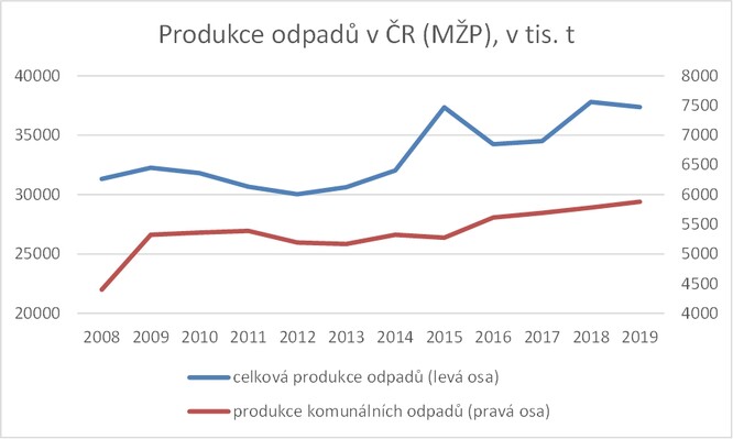 Problematika dvojích dat o odpadech zde vznikla někdy v roce 2009, kdy MŽP změnilo metodiku svého výpočtu (oficiální zdůvodnění) a navýšilo jak celkovou produkci odpadů, tak zejména produkci komunálních odpadů, viz graf níže.