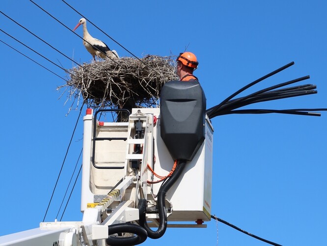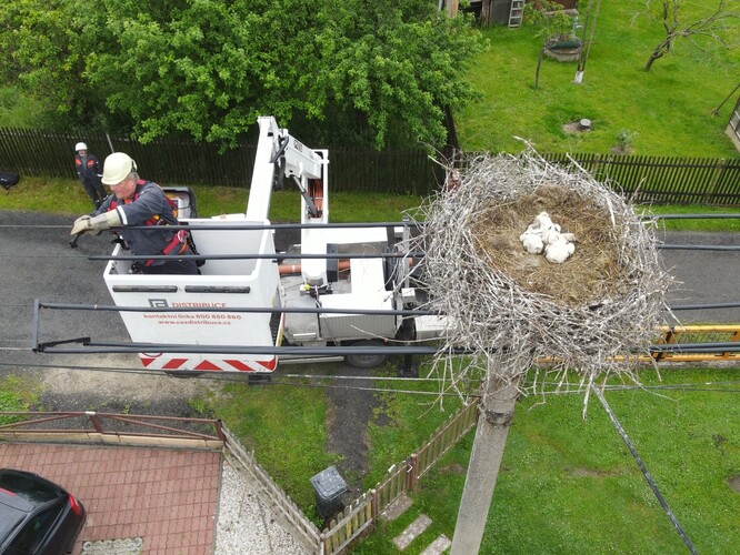 Jako například řešení a zabezpečení hnízda čápů bílých na sloupu el. vedení v Lomničce u Chebu (6. 6. 2025) nebo to samé ve Lštění (20. 6. 2025), nebo další hnízdo v Hyršově na Domažlicku a další.