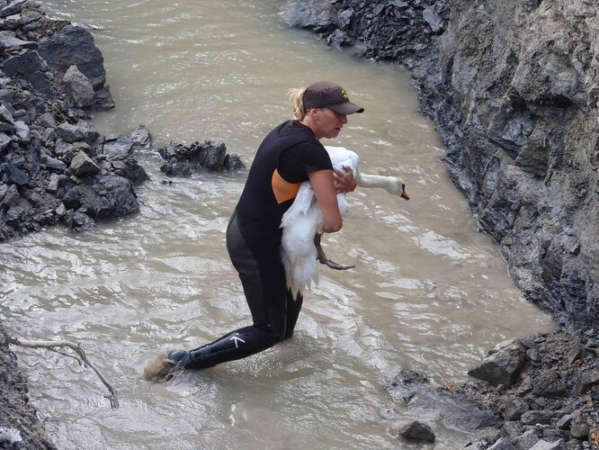 Beru telefon kolegů z městské policie volající pod první hovor. Ti mi hlásí, že do výkopu přes koryto řeky Radbuzy spadla labuť a nemůže se dostat ven. Jedu okamžitě na místo a žádám o technickou podporu a pomoc kolegyni Gábinu Křížovou. Ta dorazí na lokalitu i s manželem Jirkou a velice rychle a zdatně labuť odchytí.