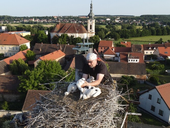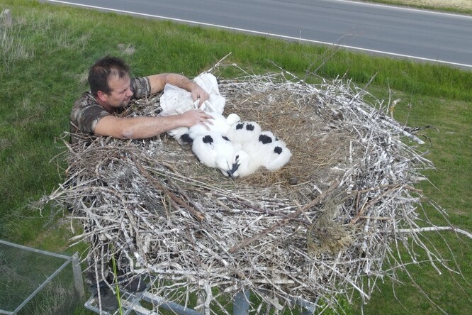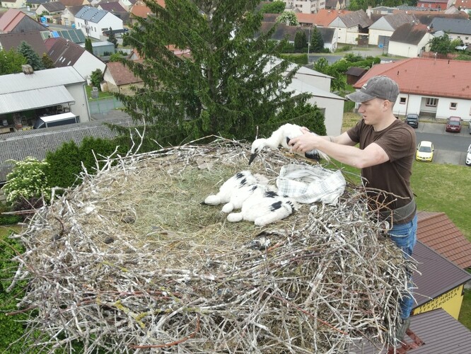 Případ, který jsem ještě za 33 let praxe nezažil. Na hnízdě v Koutě na Šumavě se čapím rodičům původně vylíhla čtyři mláďata. Poslední nejslabší mládě nepřežilo a když zbylým třem bylo kolem čtyř týdnů, jeden z rodičů se na hnízdo z neznámých důvodů jednoho dne nevrátil. Pravděpodobně se někde zabil či zranil a od té doby se o tři mláďata staral pouze jeden z rodičů. Ale i ten zhruba po týdnu přišel k úrazu (na nohu si namotal rybářský vlasec s tím, že se nám ho nepodařilo odchytit a o prstovou část nohy pravděpodobně ve finále přišel), a tak hrozilo, že nevzletná mláďata na hnízdě postupně uhynou hlady. A tak i tato čápata jsme 30. 5. 2025 po neúspěšném odchytu poraněného rodiče byli nuceni z hnízda sundat a následně dvě z nich (třetí uhynulo na stanici) adoptovat do náhradních hnízd.