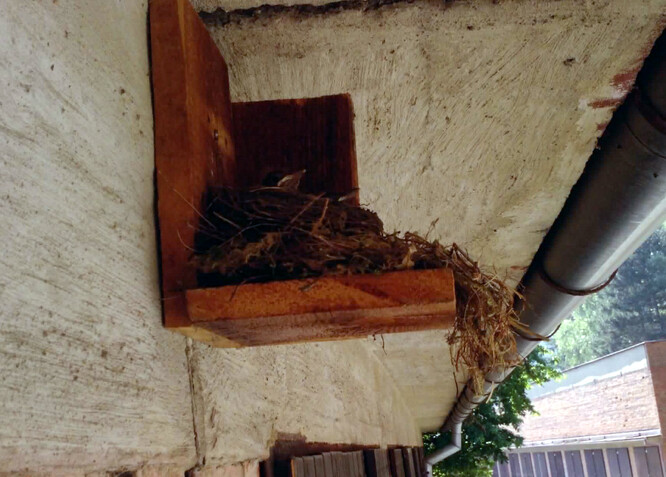hnízdí v meziprostoru mezi taškami a bedněním. Dři roky dokonce hnízdili v ocelové rouře stříšky schodiště, kde byli v bezpečí.