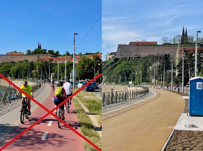 Praha v rámci rekonstrukce zrušila jednu z mála skutečných cyklostezek v Praze. Na 250 metrů dlouhém úseku pod Vyšehradem 15 let fungovala dělená stezka pro pěší a cyklisty. V rámci rekonstrukce město tento úsek ruší, cyklisté a pěší jsou tak zpátky ve smíšeném režimu. A to i přesto, že víme, že kombinovat lidi jdoucí pěšky a jedoucí na kole je zvlášť na takto vytížených trasách nevyhovující řešení.