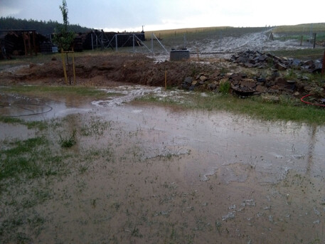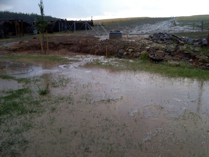 Situace po bleskových srážkách v červnu 2018. V pravém horním rohu lze vidět vodu tekoucí z pozemku až k nám na dvůr. Je jednoduché se živlu postavit do cesty, důležité však je jej řádně využít.