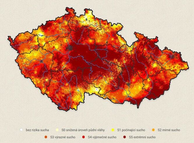 Sucho nepostupuje úplně všude stejně. Nejvíce graduje v úrodných nížinách a v oblastech srážkového stínu. Extrémní půdní sucho aktuálně postihlo již třetinu Česka. Prohlubuje se hydrologické sucho, hynutí přemnožených sinic a řas ve vodě způsobuje kritický nedostatek kyslíku, díky čemuž umírají ryby. Vodní sucho zastavuje provoz jaderných či uhelných elektráren, kterým chybí chlazení.