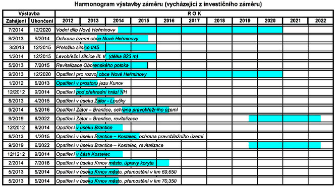 Podle plánu vlády z dubna 2008 měla být většina protipovodňových opatření hotová do roku 2016 (zbytek do roku 2022) a přehrada i s přeložením silnice I/45 pak do roku 2020, jak dokládá tabulka s časovou osou.