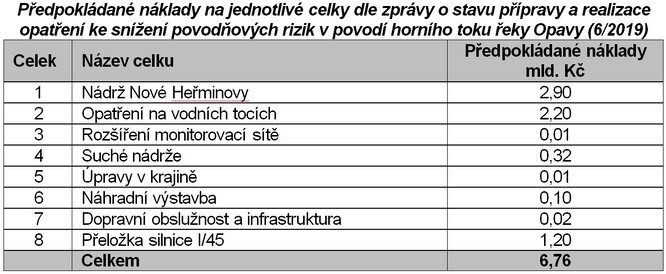 Z údajů vlády z června 2019 tedy vyplývá, že celý záměr s názvem „Opatření na Horní Opavě“ má být hotový do roku 2027, nikoliv do roku 2020 podle plánu z dubna 2008, a celkové náklady mají být asi 6,76 mld. Kč.