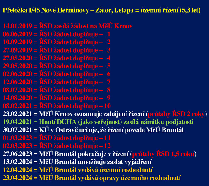 Hlavním viníkem průtahů v územním řízení pro přeložku silnice I/45 během více než 5 let bylo Ředitelství silnic a dálnic, s. p., které asi 3,5 roku svou tzv. blanketní žádost doplňovalo, jak dokládá průběh tohoto řízení.