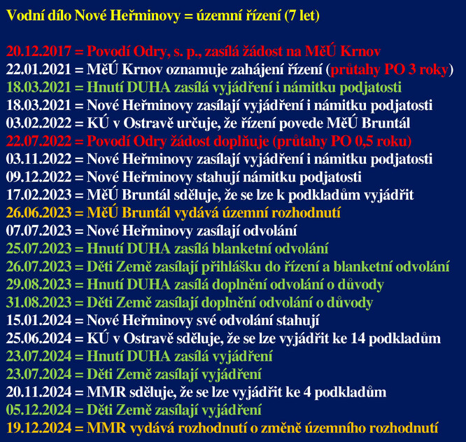 Děti Země 20. ledna 2025 zasílají ke Krajskému soudu v Ostravě správní žalobu, neboť nejsou spokojené se způsobem vypořádání svých připomínek k obsahu dvou závazných stanovisek na ochranu významných krajinných prvků, dvou stanovisek na ochranu krajinného rázu a jednoho stanoviska na ochranu okraje lesa. Rozsudek lze očekávat do května 2025. Nikdo tedy nyní nebrání tomu, aby byla stavební řízení pro přeložku silnice I/45 a pro přehradu zahájena.