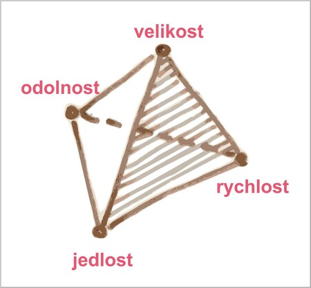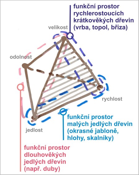 Vrchol „rychlost“ reprezentuje rychlost růstu dřeviny, ať už měřenou jednoduchostí množení (= cena rostlinného materiálu), rychlostí růstu po výsadbě (= rychle rostoucí dřeviny lze sázet malé) nebo do horších podmínek (= lacinější technologií). Mnoho rychle rostoucích dřevin (topol, bříza, javor jasanolistý, j. stříbrný, pajasan) mají krajně nepříznivé provozní vlastnosti jako je rychlé stárnutí a křehké dřevo a tak jsou v modelu namačkané u vrcholu „rychlost“. Ekologicky jde o r-stratégy, u kterých to v přírodě nevadí, ale v městských podmínkách to významně komplikuje jejich použití (= mají vysokou cenu za vlastnictví).