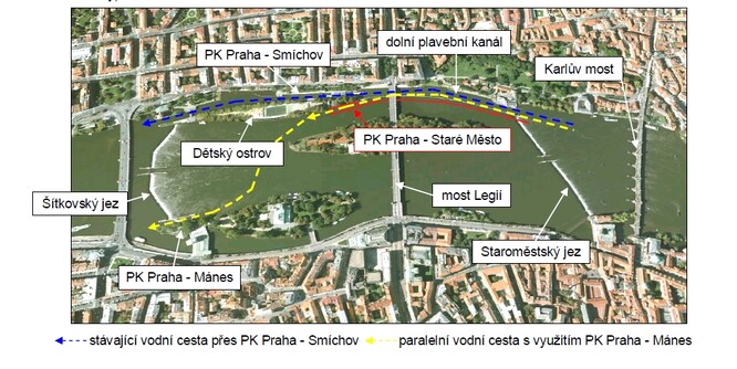 Dnešní plavební provoz probíhá plavební komorou Praha Smíchov, která překonává výškové stupně dvou jezů – Šítkovského (pod Jiráskovým mostem) a Staroměstského (nad Karlovým mostem). Propojuje tedy zdrž Šítkovského jezu rovnou se zdrží Helmovského jezu. Mezilehlá zdrž Staroměstského jezu je v současné době přístupná pouze seshora přes stávající plavební komoru Praha - Mánes. Navržená plavební komora Praha – Staré Město počítá s tím, že lodě využijí komoru Praha - Mánes a dále proplují po proudu novou komorou, která propojí zdrže Staroměstského a Helmovského jezu. Vznikne tak paralelní cesta k plavbě komorou Praha - Smíchov. Prohlédneme-li si situaci na mapě, pak vidíme, že tato nová trasa šikmo křižuje řeku přes zdrž Staroměstského jezu. Tedy křižuje střední klidnou hladinu mezi Šítkovským a Staroměstským jezem, nazývanou „zrcadlo“, která dnes představuje unikátní rekreační prostor v nejkrásnějším místě řeky mezi Národním divadlem, Petřínem, ostrovy a Karlovým mostem. Tento prostor je více než sto let rekreačně využíván pro pramice a později šlapadla. Málokterá metropole se může pochlubit takovou oázou klidu u vody a zelených ostrovů v samém srdci města. Važme si tohoto prostoru, jakmile přes něj začnou šikmo přejíždět velké turistické lodě a zajíždět až k Národnímu divadlu, bude prostředí nenávratně zničeno.