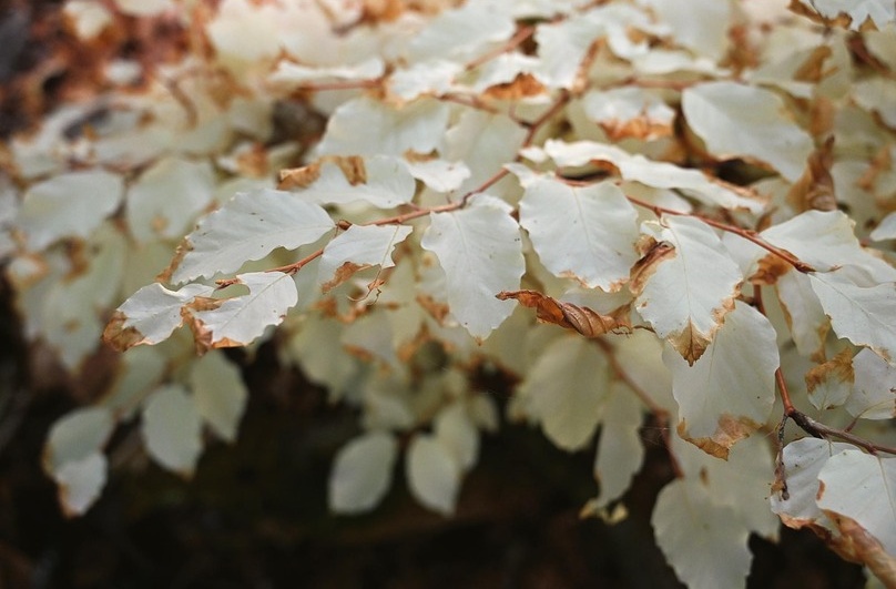 Pozorování také odhalila, že buk má v porovnání se zelenými jedinci křehčí pletiva (tenčí kutikulu, měkčí listy) a zároveň vysoký obsah rozpustných cukrů – zejména glukózy a fruktózy. Právě to může vysvětlovat výrazně častější okus zvěří i hmyzem.