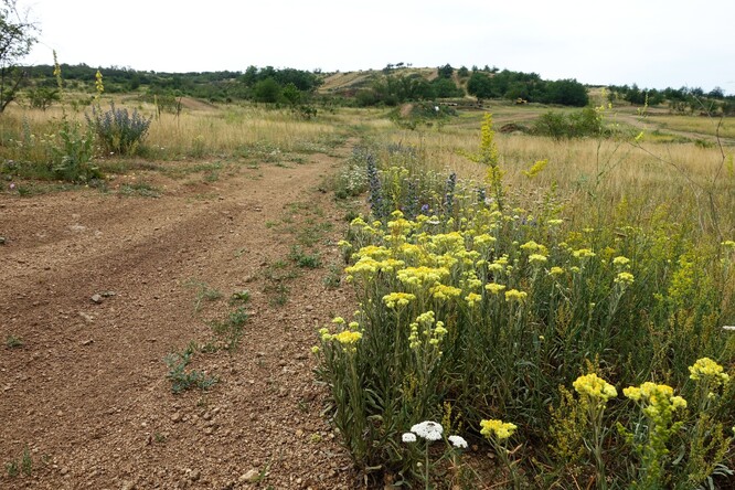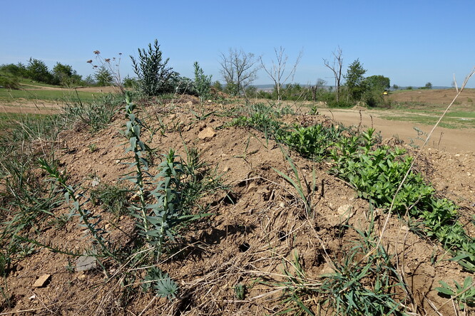 Překvapivě zajímavé jsou však i umělé překážky z úživného hlinitého materiálu. To, co na dálku působí jako nevzhledné rumiště, je při bližším pohledu pestrou směskou stepních a ruderálních druhů, přičemž přímo z holé hlíny zde vyrůstají takové druhy, jako je lnice kručinkolistá, strošek pomněnkový nebo dokonce silně ohrožená večernice smutná. Je vidět, že diaspory stepních rostlin jsou na lokalitě skutečně všudypřítomné a tyto druhy tak snadno obsazují i nové biotopy. I mezi ruderální flórou však najdeme zajímavé zástupce – za všechny jmenujme zde velmi hojný blín černý.