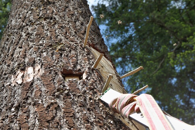 Včely, které před transportem na strom včelaři zklidnili tím, že je postříkali vodou, pomalu vysychají a začínají vylézat česnem (štěrbinovitý krytý vstup do úlu, pozn. redakce) ven a létat.