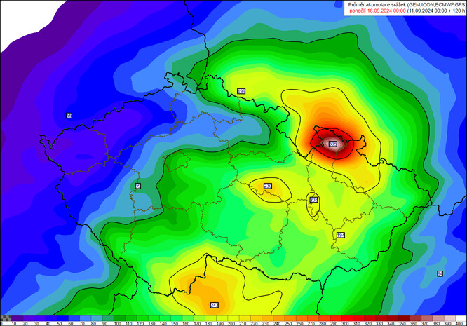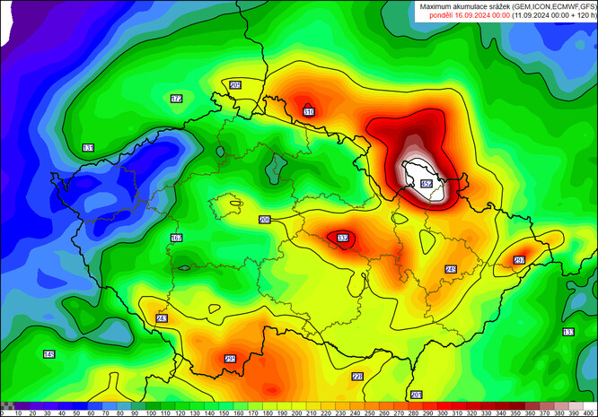 Už poměrně velká nejistota. Srážkové úhrny jsou nejčastěji 15 až 40 mm, na severozápadním návětří hor může být lokálně až k 70 mm. Deště by mělo postupně během dne ubývat na většině území.