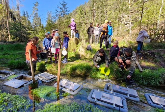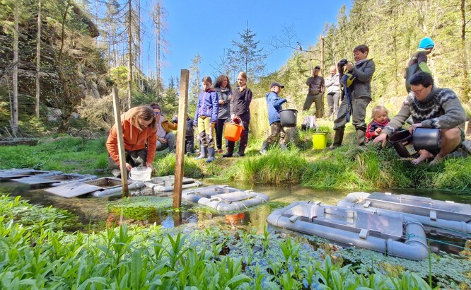 Dobrovolníci pomohli s vypuštěním malých lososů v Národním parku České Švýcarsko