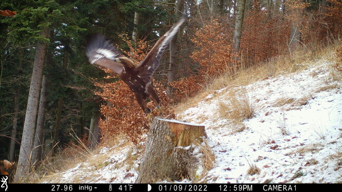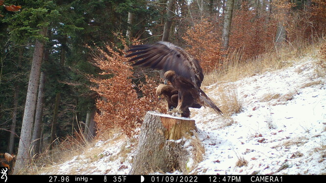 To se podařilo až teď, v prvních lednových dnech nového roku díky nainstalované fotopasti. Samice Vanda je v pořádku, v dobré kondici a ještě do poloviny března bude s rodiči na hnízdní lokalitě, pak se vydá na potulku.