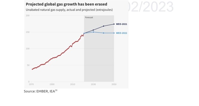 Mezinárodní energetická agentura (IEA) předpověděla, že v roce 2022 by se celosvětová poptávka po fosilních palivech mohla brzy zastavit a dlouhodobě růst. Současně zůstane celosvětová produkce uhlí a plynu obecně na stejné úrovni, protože růst poptávky v regionech Blízkého východu a Asie a Tichomoří bude kompenzován poklesem v Evropě a Americe, píše Zero Carbon Analytics s odvoláním na IEA.Poptávka po plynu v EU se v prvních devíti měsících roku 2022 snížila o více než 10 % ve srovnání se stejným obdobím roku 2021. Očekává se, že pokud EU splní své dlouhodobé závazky v oblasti změny klimatu, klesne poptávka po plynu v EU do roku 2030 o 43 % a o ne méně než 19 % i bez dalších politických změn.