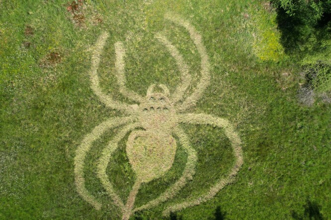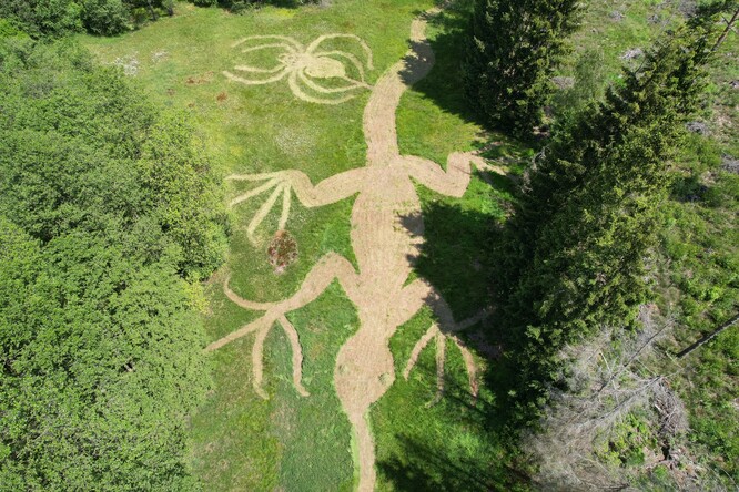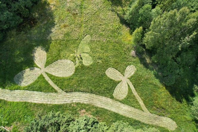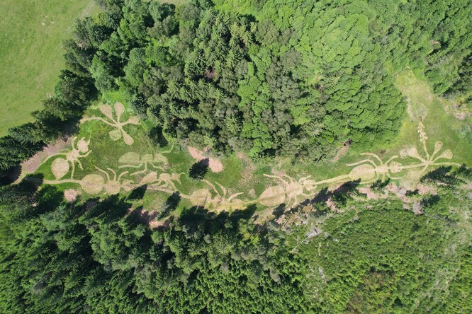 Zpočátku jsme posekali vše najednou, takže během necelého týdne zmizely vzrostlé byliny z celé půldruhahektarové plochy. Asi před patnácti lety se začala prosazovat metoda mozaikové seče. Začali jsme tak pracovat i my. Zpočátku měly naše mozaiky podobu obvyklých více méně šachovnic. Díky snímkům z dronu, které pro nás začal pořizovat Antonín Zajíček, jsme si všimli výrazných různobarevných obrazců proplétajících se linií a ploch. Přirozeně nás tedy napadlo využít jejich výtvarné možnosti.