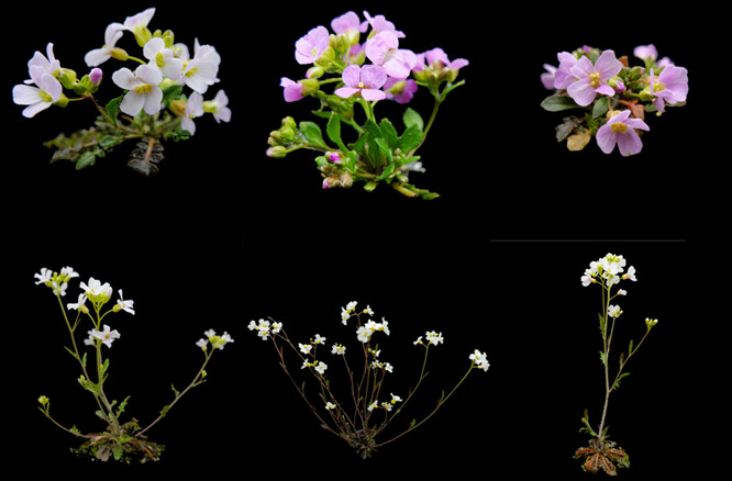 Nížinné (dole) a z nich opakovaně vzniklé a přizpůsobené horské (nahoře) formy huseníčku. Licence | Všechna práva vyhrazena. Další šíření je možné jen se souhlasem autora Zdroj | Univerzita Karlova