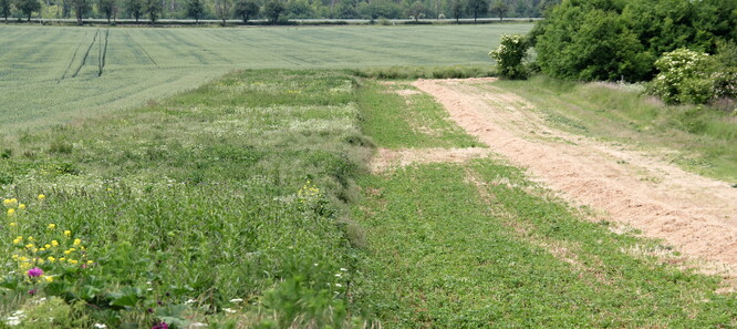 První biopás podél okraje celého pole vznikl na místních polích v roce 2018. Není to žádná raketová věda. Tady ve Vinoři je to pás po obvodu pole široký přesně na dvě šířky sekačky, kde se vyseje směs trav a bylin.