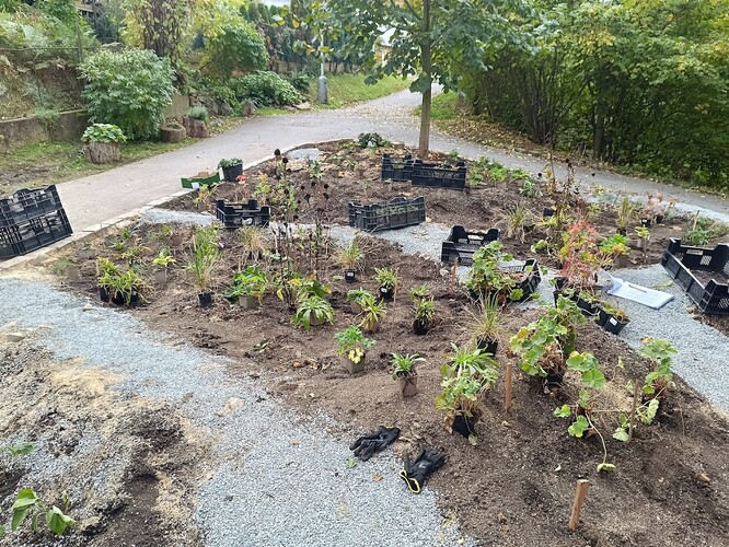 Různé materiály pak použili pro různé účely: jílovité zeminy na vybudování hrázek, naopak na vsakovací místa koupili hrubší kamenivo, písek a štěrk. V místech výsadby smíchali písek se zeminou a kompostem, aby květiny dobře rostly, ale zároveň aby se i zde voda dobře vsakovala. Hrubé zemní práce zastal bagr, odborná firma vyfrézovala kusy asfaltu a usadila odtokové žlaby. I když jsou umístěné v chodníku, musely být pojezdné, aby tudy projeli třeba hasiči (žlab je z polymerbetonu, dlouhý 5 metrů, opatřený mříží s nosností až 400 kN). Ale pak už přišla na řadu sousedská brigáda a drobné nářadí jako lopaty, motyky a kolečka.