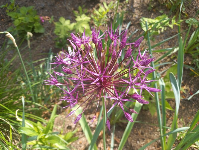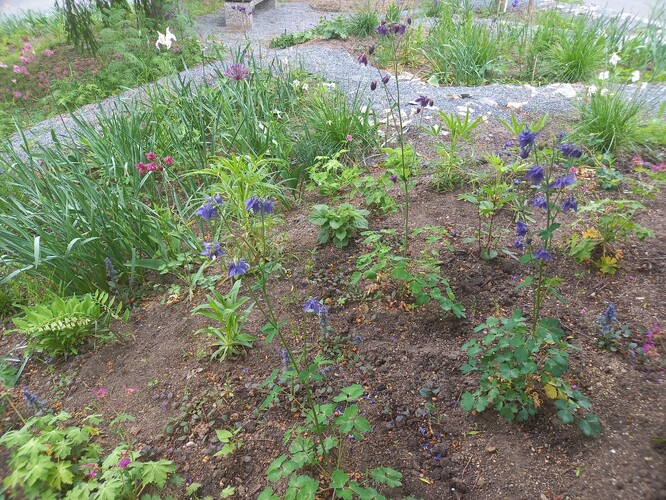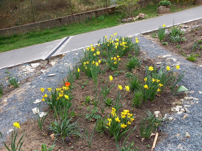A když zrovna neprší, tak záhon zdobí své okolí rozkvetlými květy. V dubnu, kdy jsem se zde byla podívat, tak byl zrovna plný narcisů a tulipánů. V polovině května zase kvetly modré a růžové orlíčky, svízel, okrasné česneky nebo zběhovce.