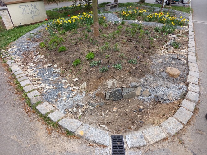 Funguje! Důkaz máme na videu, kdy Míra natočil záhon přímo v akci, koncem dubna při dešti. Je vidět, že se voda ze žlabu dostává nejdříve do větší tůňky, ze které postupně odtéká štěrkovými cestičkami do prohlubní osázených rostlinami. Místí se sem za deště chodí ze zvědavosti dívat.