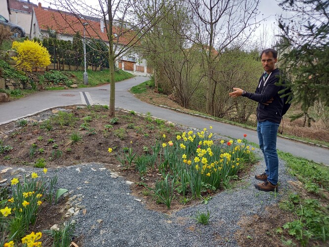 Kromě toho už mají vytipována další místa, kde by chtěli něco podobného vytvořit. Jde o městské pozemky a vize je spojit tyto úpravy s plánovanými rekonstrukcemi ulic. To je ideální řešení, protože je většinou těžší budovat podobná opatření “zpětně” – silnice bývají často pod okolním terénem, což je komplikace pro svedení vody do záhonu. A zlepší se tím nejen hospodaření s vodou ve městě, ale i estetika. Jak říká Míra: “Zahrada je moje hobby, a je hezké, když můžu přinést kousek zahrady i do veřejného prostranství.”