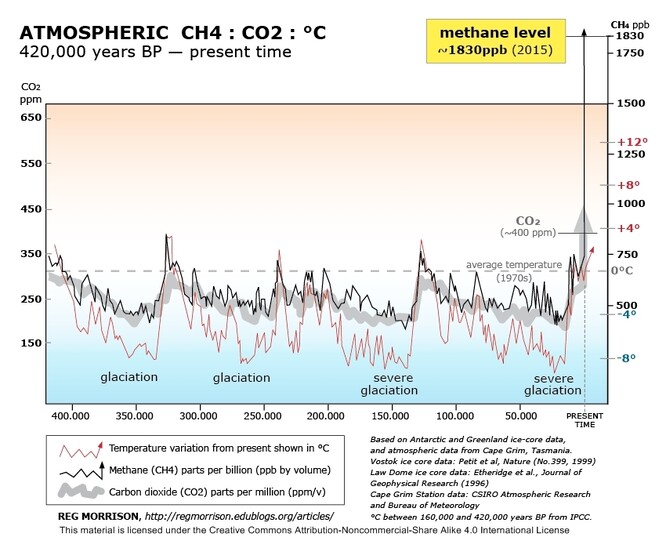 Za povšimnutí stojí vztah, že když nám roste přítomnost CO2 a metanu, roste nám teplota. Proč? Protože oba jsou výrazné skleníkové plyny.