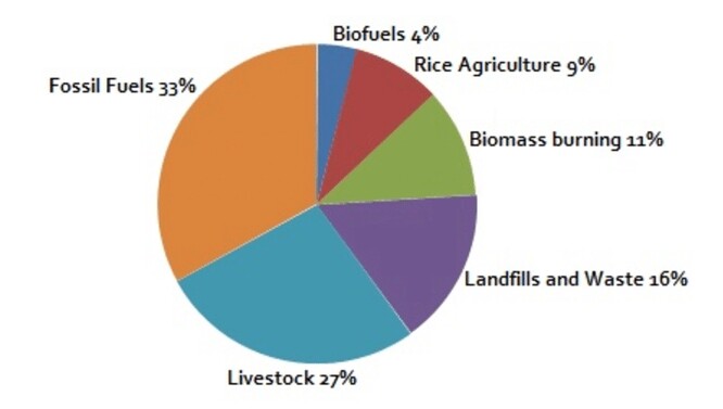 Lidé produkují ca 60 % veškerého metanu. Z toho ca 36 % připadá na produkci jídla (chov dobytka a pěstování rýže), 11 % na pálení biomasy, 16 % na skládkování a 33 % na produkci fosilních paliv!