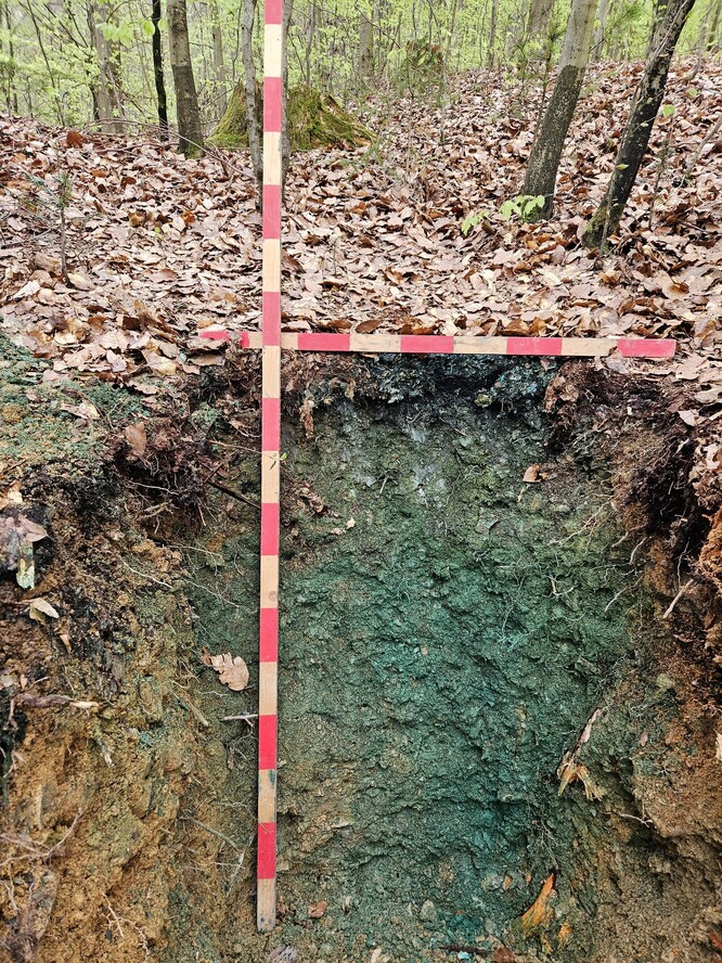 Vodu jsem nabarvili nezávadným modřidlem, abychom mohli vysledovat preferenční cesty vody. Toto je výsledek. Do zhutněné půdy voda vsakuje minimálně.
