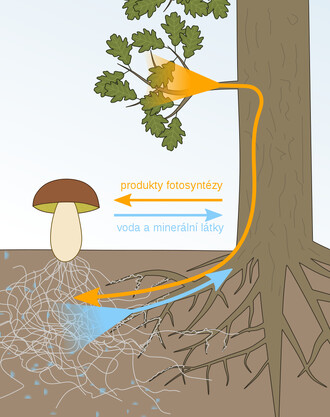 Mykorhiza je symbiotické (vzájemně prospěšné) soužití hub s kořeny vyšších rostlin. Může docházet buď k pronikání houbových vláken do kořenových buněk primární kůry (endomykorhiza), v druhém případě zůstávají vlákna jen v mezibuněčném prostoru a na povrchu kořene (ektomykorhiza).