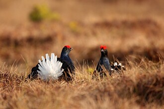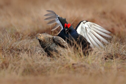 V polospánku najednou slyším zvláštní zvuky, jakoby bublání, potůček to ale není. V ranním šeru rozpoznávám dva kohoutky. Mezi nimi stojí šedohnědá, na křídlech trochu kropenatá slepička. Kohoutci už se naparují, na hlavě jsou jasně viditelné červené výrůstky nazývané poušky. Stojí teď ve stejné vzdálenosti od slepičky a důstojně našlapují. Po chvíli však mezi nimi zavládne neklid. Jeden z kohoutků odlétne velký kus stranou. A pak z louky úplně pryč. Netušíme, co se děje, nic podezřelého jsme nezaslechli, po chvíli ostření dalekohledu je však jasné, co se stalo.