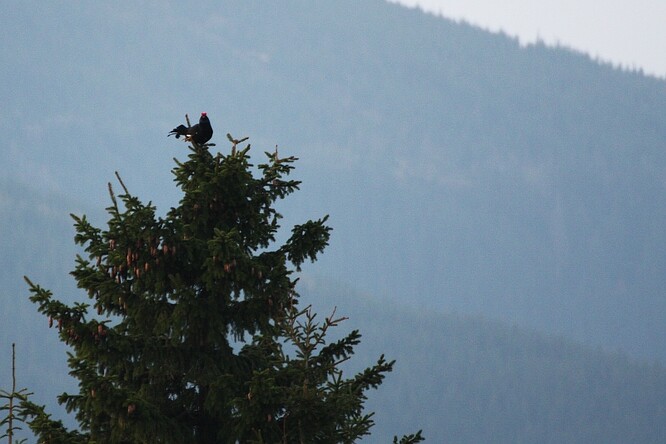 Po čase, kdy už je docela jasné světlo, nad loukou znovu zazní tetřívkovské skuhrání. Tak přece! Pozorujeme stromy kolem a opravdu vidíme samečka na vrcholku jednoho ze vzrostlých stromů. Ptáci jsou ale opatrní a odlétají pryč. Za chvíli se však znovu vracejí obhlédnout situaci.