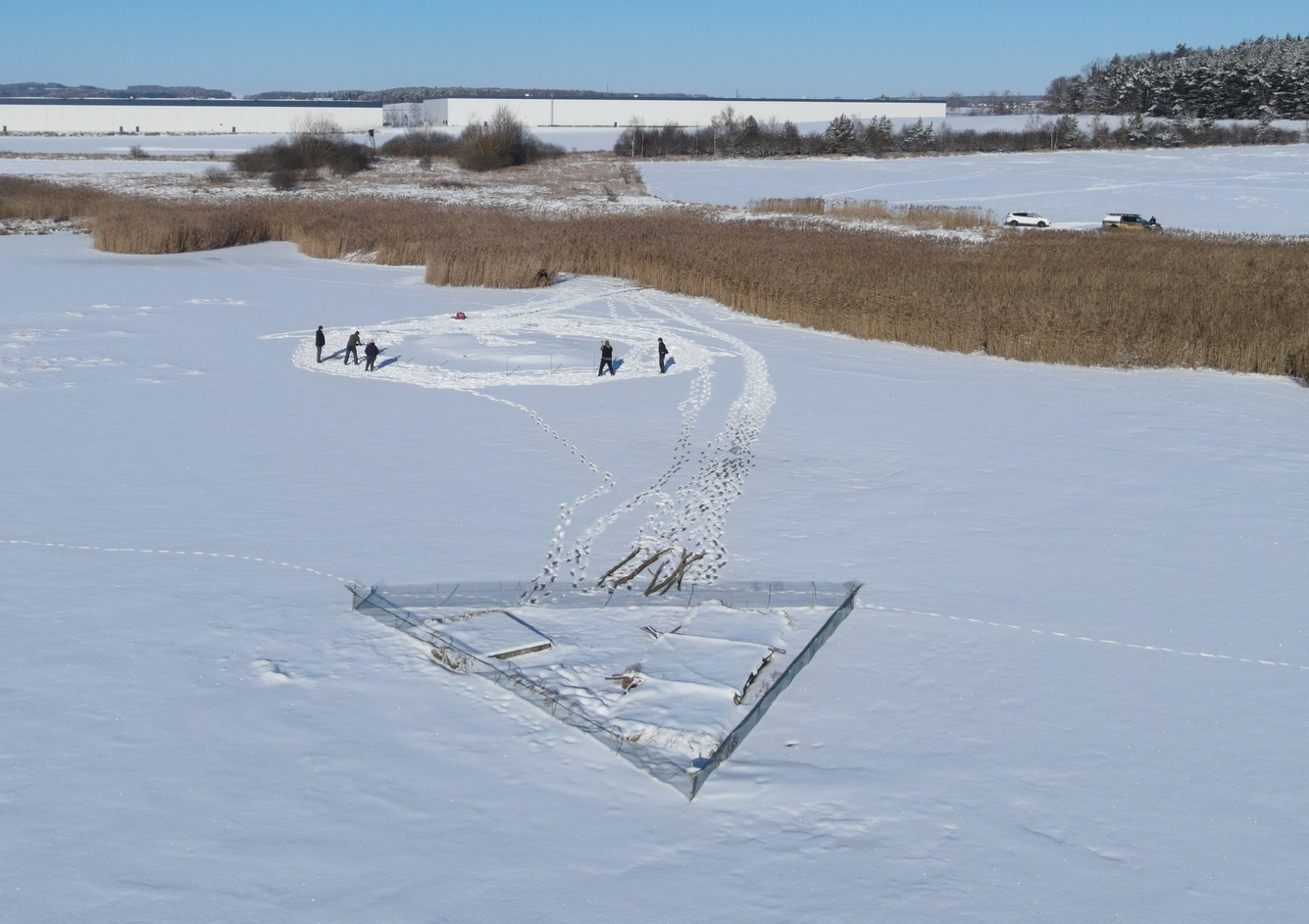 V neděli 11. ledna 2026 naše skupina opět využila zamrzlé vodní plochy, společně rozměřili a zatloukli cekem 36 pozinkovaných a 160 cm dlouhých trubek. Šestiúhelník o průměru 17 m + obdélník 6x5 m.