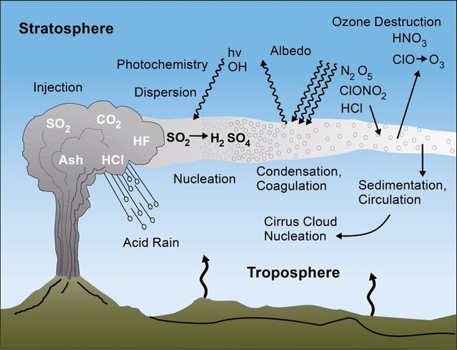 Sopečné erupce přitom dokáží SO2 dostat do stratosféry docela dost často. Jen si vzpomeňte na erupci Hunga Tonga–Hunga Haʻapai. Tehdy se mračno dostalo do výšky okolo 58 km nad povrch.